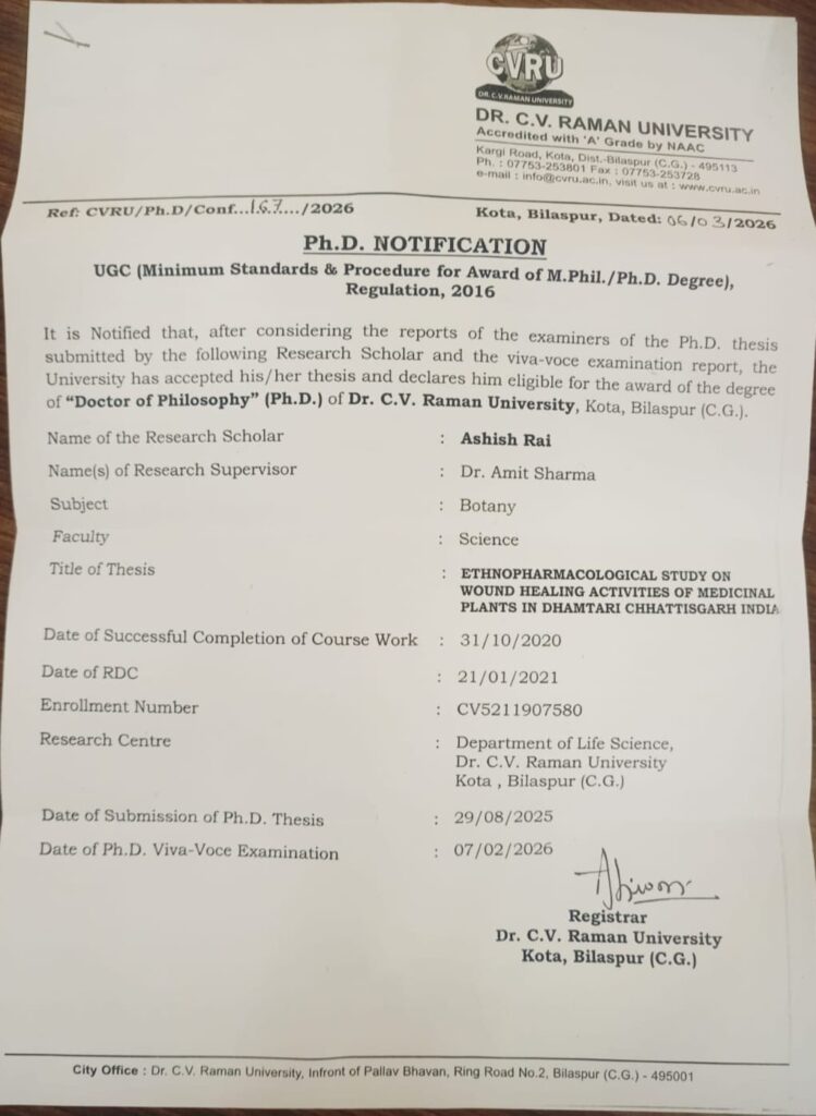 बिलासपुर। डॉ. सी. वी. रमन विश्वविद्यालय बिलासपुर के विज्ञान संकाय अंतर्गत वनस्पति विज्ञान विभाग के शोधार्थी आशीष राय को पीएचडी की उपाधि प्रदान की गई है। उन्होंने अपना शोध कार्य छत्तीसगढ़ के धमतरी जिले के आदिवासी समुदाय द्वारा घावों के उपचार में उपयोग की जाने वाली औषधीय वनस्पतियों पर केंद्रित किया। यह शोध कार्य उन्होंने डॉ. अमित शर्मा (एसोसिएट प्रोफेसर) के मार्गदर्शन में सफलतापूर्वक पूर्ण किया।