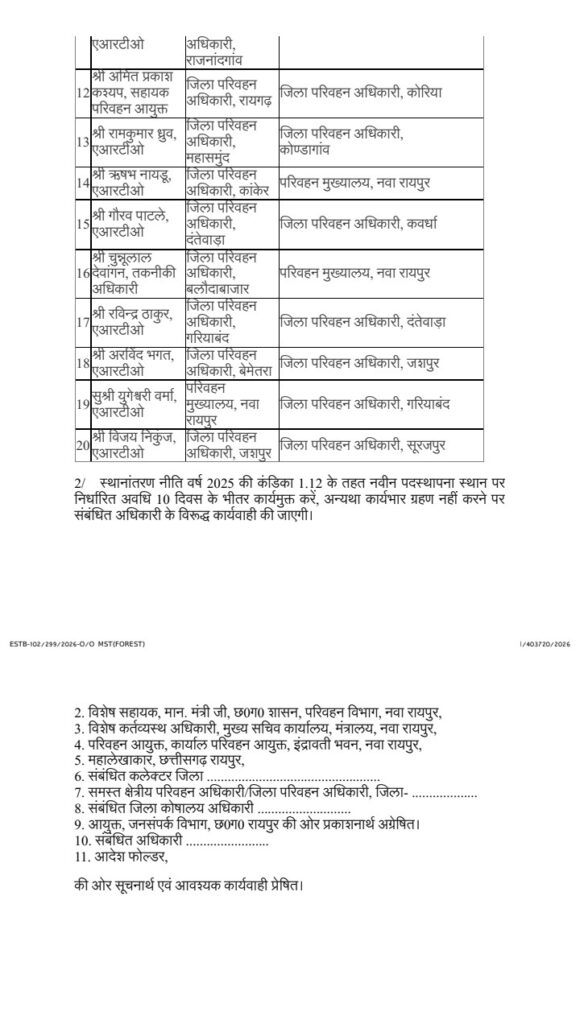 रायपुर। छत्तीसगढ़ परिवहन विभाग में थोक में जिला स्तर के अफसरों का ट्रांसफर हुआ है। यह आदेश परिवहन विभाग के संयुक्त सचिव कमलेश बंसोड ने जारी किया है।