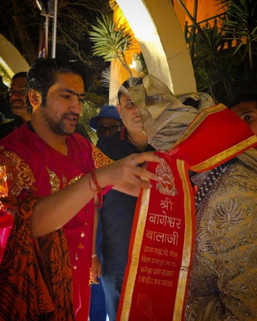 शादी के इस खास मौके पर हमेशा की तरह बाबा बागेश्वर पारंपरिक और आध्यात्मिक अंदाज में नजर आए. उन्होंने गुलाबी कुर्ता पहना था, जिसके ऊपर त्रिशूल का डिजाइन बना था जो सबका ध्यान खींच रहा था. इस दौरान बाबा बागेश्वर ने कुलदीप यादव को भगवान बालाजी की पटकी पहनाई और उन्हें देवता का एक चित्र भी उपहार में दिया. कुलदीप और वंशिका को बाबा बागेश्वर ने उनके वैवाहिक जीवन के लिए अपनी शुभकामनाएं भी दीं.