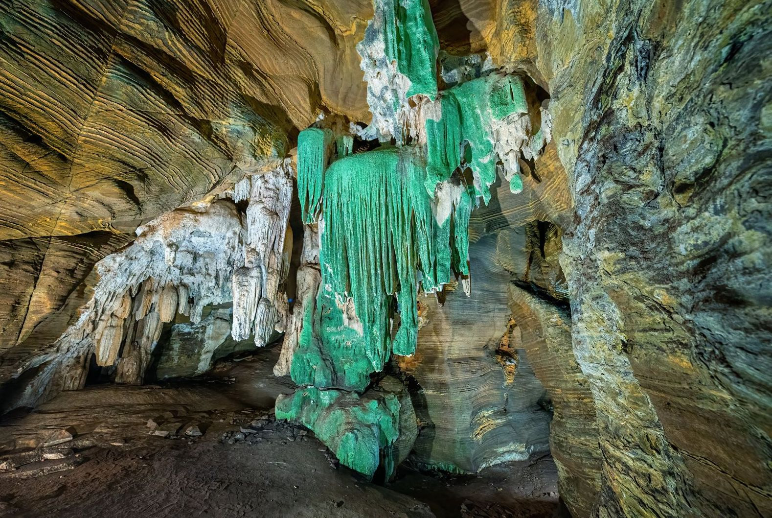 ग्रीन गुफा तक पहुंचने का मार्ग बड़े-बड़े पत्थरों से होकर गुजरता है। गुफा में प्रवेश करते ही सूक्ष्मजीवी जमाव से ढकी हरी दीवारें पर्यटकों को आकर्षित करती हैं। आगे बढ़ने पर एक विशाल कक्ष दिखाई देता है, जहां से भीतर की ओर चमकदार और विशाल स्टैलेक्टाइट्स तथा फ्लो-स्टोन (बहते पानी से बनी पत्थर की परतें) देखने को मिलती हैं, जो गुफा की प्राकृतिक भव्यता को और भी बढ़ा देती हैं।