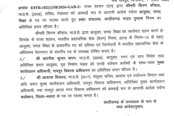 IAS अवनीश शरण और किरण कौशल को अतिरिक्त प्रभार, आकाश छिकारा बस्तर कलेक्टर बने